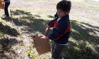 These little workers soon learn the art of picking, green ones are not ready, black ones are too old, pretty ones with nice print are the treasure to go after. Charlotte's frown fell off her face as quickly as she jumped off her stroller, marched straight to plea for a brown bag almost as large as she is ,and waddled along leaving no pecan nut unpicked in her way. They laboured so hard and when they could no longer carry the weight of their own harvest, they turn to me for help with completely fulfilled smiles.